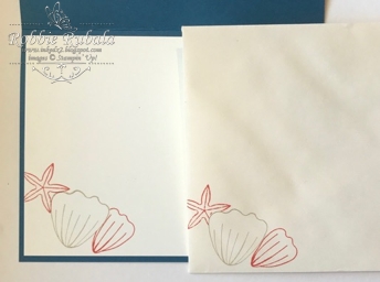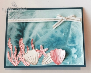 I recently saw a technique I remembered I wanted to try. I thought this would be the perfect challenge for that technique. The technique is plastic wrap watercolor. You start with a piece of plastic wrap larger than your watercolor paper. You spritz it with a lot of water. Then you drop reinkers on your plastic wrap ~ I used Pool Party, Marina Mist, and Dapper Denim. Next you take your watercolor paper and lay it onto the plastic wrap. Quickly flip the plastic wrap over and scrunch it up to form interesting patterns. Let it dry overnight. The next morning remove the plastic wrap. If it is not totally dry let it finish drying. The plastic wrap forms interesting patterns that dry to give you a fun background. I stamped and cut the coral and seashells and added them to my background. To finish it off I added some gold natural trim ribbon. This layer was attached to a Dapper Denim card base. Here is the completed creation.