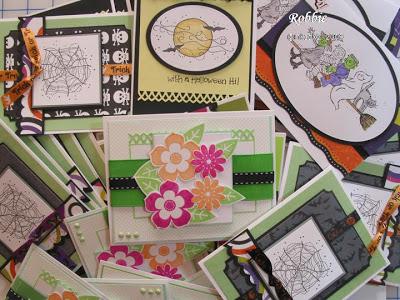Have you wondered why I have been missing in action lately? Well I have been busy mass producing Halloween cards. I wanted to send some to the Cards for Heros group but I also have adopted my son-in-laws unit in Afghanistan. He said there are about 20 guys in his unit and they have a 2 mile walk to get cards so I told him I would make cards and send to him and he could put them in his work place and the guys and gals could take them as needed. I was able to make 50 cards in the last 4 days (40 of which are Halloween cards). Here is the picture.