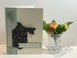 I liked this and started thinking about the 2 star elements. I was thinking they could be 2 different shapes so I started looking in the catalog at the framelits. I found a shape I liked in the Chalk Talk framelits. I then thought about using a bow for the smaller shape. I saw one in another set of framelits but then decided to use the bow punch. Now I needed the strip down the side and sentiment strip. I pulled out my Timeless Elegance ds paper for the 2 shapes and then found another piece for the strip. So I used the Timeless Elegance paper for the major elements of the card. I decided to use the sponge method to ink up the leaves and not ink the flower. This way I could use Mint Macaron ink as the accent color. Here is what my finished project looked like.