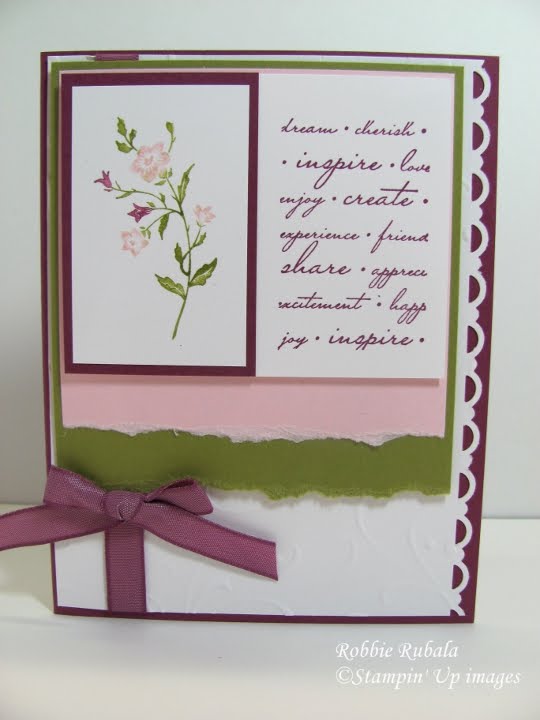 My card today is a special card I made for the Late Night Stampers design team swap. I love this card. I knew I wanted to use the It’s Charming stamp set. I stamped the script on a piece of Whisper White cardstock. I then used markers to color the flower image. I stamped it on Whisper White and mounted it on Rich Razzleberry. I tore a piece of Pretty in Pink and Old Olive cardstock and mounted it on a piece of Whisper White that I had embossed with the Perfect Details texturz plate and then punched the edge with the scallop trim punch. I added the Rich Razzleberry taffeta ribbon and mounted on a Rich Razzleberry card. I mounted the pink and olive layer using dimensionals. The script and flower layer was mounted on the card using dimensionals. Here is what the final card looked like.