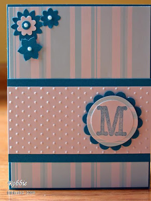 Stamps: Clear Alphabet (JustRite) Paper: Taken with Teal, white, striped paper (from my scrap pile) Ink: Taken with Teal Accessories: Scallop circle – 1 3/8″ circle – 1 1/4″ circle – Boho Blossoms punches, Cuttlebug Swiss Dots embossing folder, half back pearls (Michael’s), dimensionals