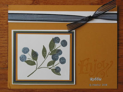 Stamps: Best Blossoms, Everyday Expressions (both retired) Paper: Always Artichoke, More Mustard, Night of Navy, white Ink: Always Artichoke, More Mustard, Night of Navy, Versamark Accessories: Iced Blue Raspberry Lemonade Kool-Aid, clear embossing powder, ribbon (Pink Hedgehog), sticky tape, dimensionals