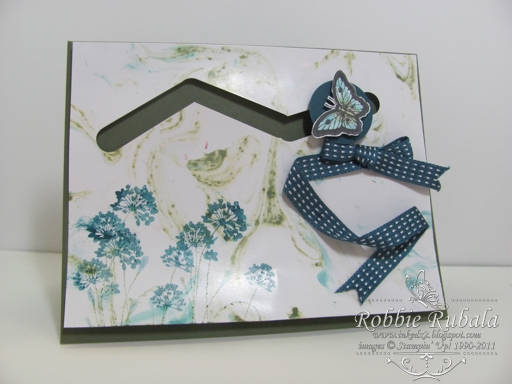 I thought it would be fun to have a butterfly on the spinner as the have a tendency to flit about. When I put my butterfly on my spinner it was too small so I had to add a punched circle behind it. I also was originally going to have my butterfly going down the side of the card but opted or it to go across the top of the card.
