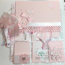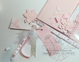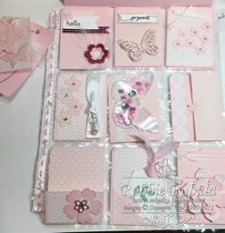 I began by pulling my Pink Pirouette card stock and Pink Pirouette patterned paper stack. I saw in a video where someone had made a large flap for the front of her pocket letter. I decided to make one for my pocket letter. After I had the flap created, I punched the bottom with a border punch I have. I then added some patterned paper to the flap. I needed a way to keep the flap closed, so I attached a mini magnet I had to the back of it and then wrapped a ribbon around the flap to hide the magnet. I attached the ribbon in the lower left hand corner as I could then use my punched flowers to hid the seam. I punched my flowers as well as a bow and some butterflies. I added a heart in the upper right hand corner. I topped my flowers and butterfly off with some rhinestones. My flap was finished now to move on to the pockets.