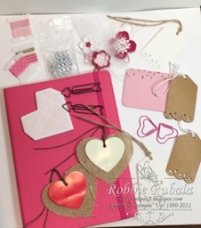 Now that I had the front of my pocket letter and flap completed, I needed to add all my goodies. I had picked up a few things here and there and also made some cute items she could use for other pocket letters. I included some washi tape, rhinestones, tags, shaped paper clips, flower embellishments, and a bright pink notebook. Here is a picture of all the items.