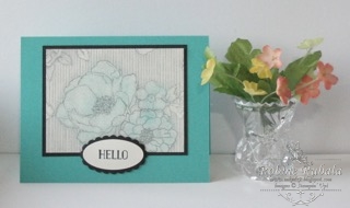 I love this paper and I used the Basic Black, Sahara Sand, and Very Vanilla for the cards in the box so I wanted to show them that they can use other colors with these papers as well. I love black and Bermuda Bay together so I decided to to use those on my card. I chose my paper and then using the ink pad and a sponge dauber I colored the flowers on the paper. Then I just needed to add my mat and attach to my card. I needed a sentiment to I went to my Tin of Cards set as it has some great ones. I chose a simple Hello. Here is my final creation.