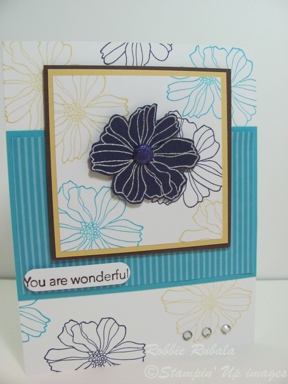 When I am doing the color or sketch challenges I sometimes start with the color and look at my sets, or I will look at the sketch and choose my set, or I will even start with the set and find a color challenge or sketch challenge that seems to fit. In this case I used the sketch and when I looked in my catalog at my sets I realized I had not used Fifth Avenue Floral in quite a while so I decided to use my favorite flower in this set – the daisy. I stamped the daisies in the colors on white and then stamped it again on the Concord with White Craft and embossed it with white. I then cut it out. I added a Concord glitter brad in the center and popped it on the panel. I decided to add some layers – So Saffron and Chocolate Chip. I used some patterned paper in Turquoise and add the middle layer of the sketch. When I laid the elements on the card it was missing something so I decided to stamp the daisy flower in the variety of colors on the card. It was then ready to have the layers added. To finish it off I added 3 rhinestones at the bottom. Here is my finished creation.