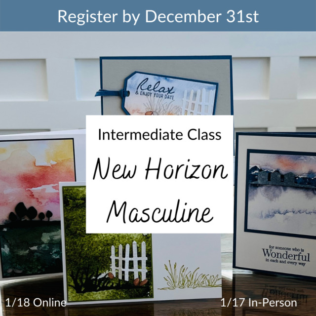 Using the New Horizons bundle we will be making 8 masculine greeting cards. That’s two each of 4 designs! The pattern paper and die cuts are perfect for pairing to create these masculine cards. As an added bonus when the class is over you will have the supplies you did not use to continue making more masculine cards.