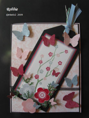 Stamps: Eastern Blooms Paper: Basic Black, Bordering Blue, Pink Pirouette, Rose Red, white Ink: Bordering Blue, Pink Pirouette, Rose Red Accessories: Bordering Blue – Garden Green – Pink Pirouette – Rose Red markers, branch – classic butterfly – 3 – in – 1 butterfly punches (Martha Stewart), ribbon (Pink Hedgehog & Ribbons and Bows Oh My), Opal Shimmerz, sticky tape, dimensionals