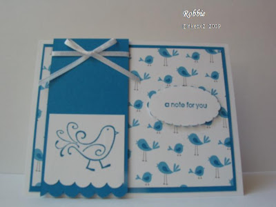 Stamps: Sweet Little Sentiments (hostess), Sketched Bird (Hero Arts) Paper: Pacific Point, white, Good Morning Sunshine DS Ink: Pacific Point Accessories: oval and scalloped border punches, ribbon (Michael’s), sticky tape, dimensionals