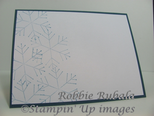 I needed another card for my workshop this week and I thought this would make a good sketch to follow. I slide the top strip and image to the bottom as I wanted to use the Northern Flurry embossing folder and the image was better with the switch. After I embossed the image I used my sponge dauber and applied some Night of Navy ink to the snowflakes. I stamped the Simple Snowflake with a second generation stamping then used the punch to punch it out. I punched out another one from Night of Navy. I added some Night of Navy ds paper along with some skinny sparkly ribbon. Love how it turned out. Here is my creation.