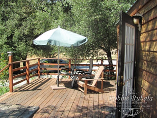Here are pics of our cabin. The cabin was 1 room, had no tv other than videos and dvd’s, used a swamp cooler rather than an air conditioner, and created it’s own electricity from solar and a generator. This was the deck.