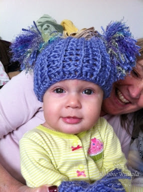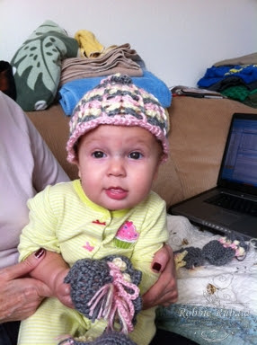 My post today is not about stamping. While I was in San Jose visiting my youngest I spent some of my time crocheting. Jess had asked me for some hats and mittens for Zoie so I was busy making some cute things. When I got back Zoie had to do a fashion show for her mom and I. Here are the pics of what I made.