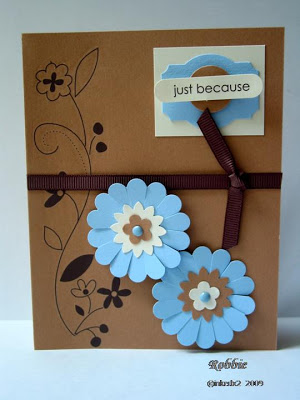 Paper: Bashful Blue, Creamy Caramel, Very Vanilla Accessories: ribbon and Bashful Blue brads (both from Pink Hedgehog), rub ons (SAB several years ago), Word Window – Designer Label – 3/4″ circle – Trio Flower – Scalloped Circle – Boho Blossoms punches, sticky tape, dimensionals