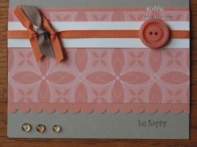 Stamps: So Many Sayings (retired) Paper: Groovy Guava cardstock and Patterned Paper (retired), Kraft, Very Vanilla Ink: Chocolate Chip Accessories: Button (Pink Hedgehog), ribbon (Ribbons and Bows Oh My), dew drops (Jody’s online share), scallop punch, Zots, sticky tape