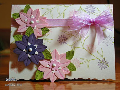 Wow, what a title. I absolutely love this card!!!!!!!!!!!!! I used my 5 petal flower punch to create a card for a commitment I had (you can actually see the other card on February 21 here on my blog). I liked the flowers so I modified the flower and came up with this flower that looks so cool. I also used the punch to make the leaves on the flowers.