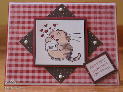 I used another Penny Black image I had stamped using my sister’s stamps. He is a cute kitty and I thought the Bella Rose paper would be a good way to make the card less feminine. It was a fun card to make and took about 10 minutes so it was a fast one. Here is the sketch and my creation.