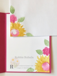 Today I used another watercolor technique I saw online. The original idea used watercolor paint to paint the stamp. I opted to just use our ink. I inked up the stamp and then spritzed it with water. This was then stamped onto the watercolor paper that I had painted with water. You then have to let this dry completely. Once the images are dry you take the second layer stamp or the same stamp and ink it up then stamp it on top of your watercolor image. This will give you a bold image. If you want to soften it, take your aqua painter and water and soften the edges. I did that a little with the center of the large flower but with the leaves, I softened it more so there were not distinct lines. For the smaller flower, I did not use any water on it as the watercolored one was pretty blurred out and you can barely see the second stamped image. Set this aside to dry completely again. To finish off the center of the large flower, ink up the center and spritz it with water then stamp it into the center of the flower. Once it is dry, stamp your sentiment. Add Tear & Tape to the back and add it to the Rose Red card base. Here is the completed Painted Harvest in Watercolor.