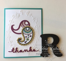 I have a Paisleys & Posies class next week so I wanted to make another sample to share with the ladies taking the class. I began by choosing my colors to use – Bermuda Bay, Crushed Curry, and Rich Razzleberry. After that I stamped and colored the scallop image. I then used the matching framelits to cut it out. I also cut out one of the other framelits using Rich Razzleberry card stock. I took a layer of Whisper White and used the Pretty Paisleys textured impression embossing folder to emboss the white layer. I attached this to my Bermuda Bay card base. After determining the placement of my paisleys I attached to my layer using Tombow multipurpose liquid glue for the on on the bottom and dimensionals for the one on top. Next I took the retired Greetings Thinlits and cut out the “Thanks” from white 4 times and once from Rich Razzleberry. I used the Tombow glue to layer them on top of each other. It was then attached to my card using the Tombow. This added some dimension to my sentiment. Here is my completed card.