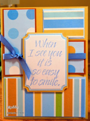 Stamps: To Smile (Penny Black) Paper: Bashful Blue, Pumpkin Pie, So Saffron, white, Nana’s Kids (DCWV) Ink: Bashful Blue Accessories: Bluebird ribbon (Stampin’ Up), dimensionalsThis was a quick card once I decided on all the colors. Think about a simple layout like this when you have a saying you want to use without an image. Thanks for looking and have a great day!