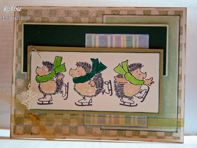 Stamps: Hedgey Shuffle (Penny Black) Paper: Brushed Gold, white, River Rock checked PP (Scrap Pads – Provo Craft), other patterns (from my scrap pile) Ink: Palette Noir Black , Brocade Blue, Handsome Hunter, Sage ShadowAccessories: ribbon (JoAnn’s), snowflake (Michael’s), Blush Blossom – Gable Green – Glorious Green – Going Gray – Green Galore – Pretty in Pink markers, Stardust Gelly Roll pen, crystal effects, sticky tape, dimensionals