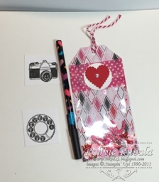 a tag, pen, and stamped images she also sent