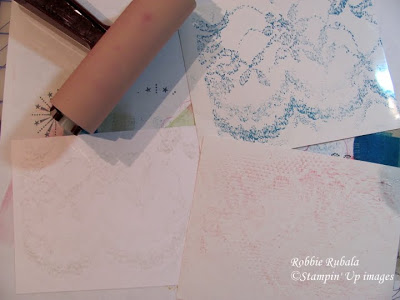 I wanted to make sure I did a post today with a card that used the brayer. I was searching for techniques at you tube and I ran across one where the lady used paint and lace. Well leave it to me to see if I can do it with ink. I took some time and tried several pieces of lace as well as different cardstocks and inks. I am going to post the picture and then I will explain a little. Here are my samples.