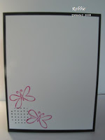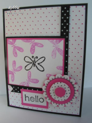 The inspiration for this card came from a scalloped scrap that I had punched the center out of. I saw the sketch at Card Patterns and thought I could use the scrap for the circular element in the lower right corner. I then thought it would be fun to use the color challenge at Caardvarks of black, white, and hot pink. When I thought of the colors and the scrap I immediately thought of polka dots and the rest was easy.