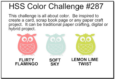 These colors were so Spring like that I had to use them to create a fun Spring card. I decided to use my Pop of Paradise set to create a fun scene. I began with my cloud template and using Soft Sky added some puffy clouds at the top of my Whisper White panel. Next Lemon Lime Twist was used along with the leaves to create some leaves at the bottom. I also stamped one of each leaf onto a scrap of Whisper White. Taking a Basic Black and Flirty Flamingo marker, I colored the flamingo stamp and stamped it onto a scrap of Whisper White. I them cut the 3 images out. The flamingo was added to the bottom of the panel using dimensionals. The leaves were then attached on each side of the flamingo using dimensionals. The completed panel was added to the Soft Sky card base using Snail. Here is my completed Pop of Paradise creation.