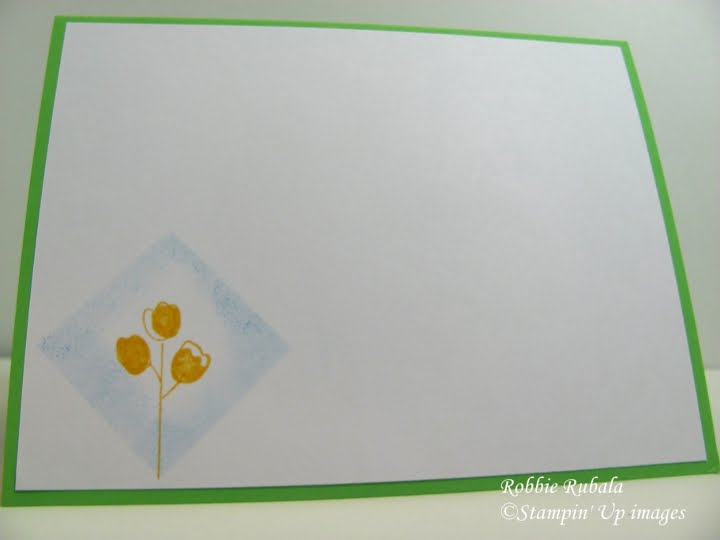 Stamps: Awash with Flowers, Hello Again, Flight of the Butterfly Paper: Ballet Blue, Crushed Curry, Green Galore, white, Presto Pattern specialty paper Ink: Ballet Blue, Crushed Curry, Green Galore Accessories: 1 1/4 & 1 3/8 inch square punches, sponges, sponge daubers, sticky tape, dimensionals