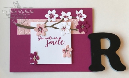 I used the Seasonal Layers Thinlits to cut out my branch and flowers. The markers were used to add some interest to the center and rhinestones were added to some of the flowers. The sentiment was stamped with the Berry Burst ink. A piece of Powder Pink card stock was embossed with the Petal Burst embossing folder. To a Berry Burst card base I added the embossed piece. I then used dimensionals to add the sentiment layer. The branch and flowers were added to complete the card. I took a little liberty with the sketch but you can see how it inspired me. Here is my creation.