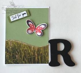 Today our Product Focus is all about stamp sets that are carrying over. I have already pulled all my retiring stamp sets and only have my carrying over stamp sets on my shelf. So to choose my stamp set I just looked on my shelf. I found one set that I was glad to see did not retire. I decided I had to use the Watercolor Wings stamp set. I thought I would pair it with the Serene Scenery dsp. I chose the paper that was blades of grass. I cut the edge in a curve and attached it to my Pear Pizzazz layer. I cut a thin strip of the gold glimmer paper and added dots of glue to the back then set aside to dry. The butterfly was next so I stamped it first with Pink Pirouette. The next layer was stamped with Watermelon Wonder. The final layer was Basic Gray. The matching framelits were used to cut it out. It was added to my card with a dimensional. Now I needed a sentiment. I stamped one of the ones in the set with Memento Tuxedo Black. I cut it down and used the retired Washi Label punch on the ends. I used a scrap of Old Olive and the same punch to make the bottom layer for the sentiment. I added it with dimensionals. also. Here is my completed creation.