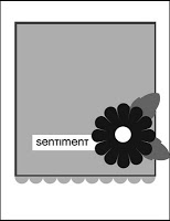 I chose my colors to match the paper. When I saw the flower on the sketch I wanted to use my scalloped circle and cut the scallops. When I did this I thought of daisies (my favorite flower) and decided a yellow center would be perfect. I also remembered I had some sparkly black organdy ribbon that would look nice. When I went looking I also found some yellow that I decided to use also.
