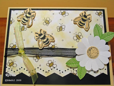I was looking for a quick and simple card and on the Clean and Simple Stamping Blog Natasha posted a great sketch. This was my starting point. I ran across a new blog (just started Friday) where 6 very talented ladies have pooled their efforts and post a weekly challenge. Stampin’ B’s Design Team posted a challenge to use a bee on your card. When I read this I immediately thought of a pattered paper I had that had bees all over it that would be perfect if I had any left. I went looking and luckily I had some left.