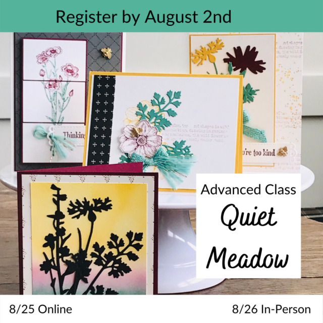 Join me for this 2 hour Advanced Class where we will use beautiful paper and make some late Summer cards. We will be making 8 all occasion greeting cards. That’s two each of 4 designs which will include some pretty flowers from the Quiet Meadow stamp set.