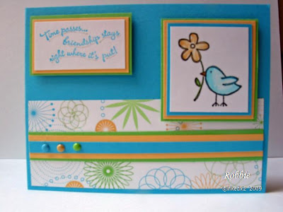 Today’s card is bright and cheerful (got to have some brightness somewhere). I began by stamping my image and coloring it using the colors from the Rainbow Sherbet DS paper. Then it was a matter of layering my 3 elements and putting the card together. A quick card. Here is my creation.
