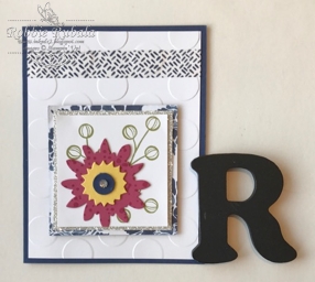 There are several embossing folders that I will miss so this was a hard one for me. I do a monthly collage class and this month I went with flowers. I used some of the Floral Boutique dsp along with glimmer paper. I needed 9 squares which I actually designed when I was in North Carolina. When I got home I was going to put the collage together and panicked because I thought I needed 12 squares. I quickly made 3 more and went to put the collage together. I then realized I had 3 extra squares. I figured I would use them to make a card. My share today is one of those squares. I used the Falling Flowers stamp set to stamp my green sprigs. Using the Flower Fair framelits I cut out the flower and the spikey layer. The blue layer is a 1/2″ circle. The pieces were layered together to make my flower then added to my sprig base. A rhinestone was added to the center of the flower. The flower layer was added to a Dazzling Diamond layer which was added to the Floral Boutique dsp layer. My background layer was white that was embossed with the large polka dot embossing folder. I also added a strip of the Floral Boutique washi tape. This layer was added to a Night of Navy card base. The flower panel was added with dimensionals. Here is my completed creation.