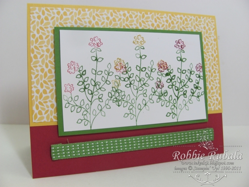 I took the opportunity to use another set that will retire on June 1. I love the Herb Expressions set for the images and the the sentiments. There is nothing in the new catalog that is similar to it. I will be on the hunt to find a new set. I used some of the new Floral District ds paper, Raspberry Ripple and Gumball Green cardstock, and Gumball Green satin stitched ribbon. I used the new markers to color the image. They are very juicy so they will take some getting use to. Here is my creation.