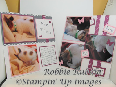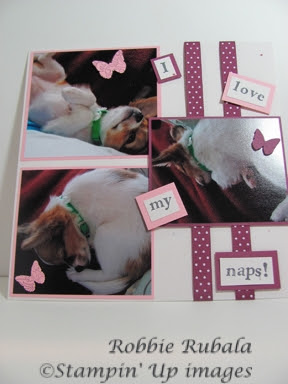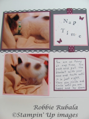 I worked yesterday on Bijou’s scrapbook. My completed double spread fits 2 challenges. The Stamp-a-holics have a challenge this week to make a scrapbook page with a love theme. Bijou’s page is all about her love of taking naps. I just love the pictures I had taken of her in her various poses while asleep. Since I used punches of butterflies it also fits the punches challenges at Creative Sketches. Here is my 2 page spread for Bijou’s book.