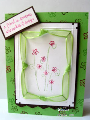 Well I missed the color challenge on the Color Throwdown blog but I am coming in under the wire for the sketch challenge at the Eat Sleep Stamp blog. The color challenge was to use Chocolate Chip, Green Galore, and Pink Passion. I also was able to do a challenge at a new blog that is advertising itself as a “source of inspiration and information “. The Next Level blog went live at the beginning of the month and they have already posted several tutorials as well as the challenge I used on this card. The challenge they issued was to use a ribbon border on your card. They gave the directions so it was easier than it looks. Here is the sketch and my creation.
