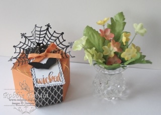 Each month I give the ladies who come to my workshop a special treat. This month I found a cute idea at Erica Cerwin’s Pink Buckaroo blog that I had to make. I did not have the gift bag punch board so I had to combine her tutorial with a tutorial at Caroline Wright at Crafty Caroline Creates blog. Between the 2 ladies I was able to create my version. I filled this little treat holder with some goodies for them to eat. Here is my version of the 2 boxes.