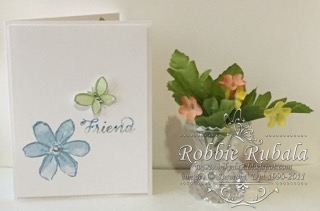I wondered what I could stamp using these colors. I started looking at my sets and I ran across the Garden in Bloom. I realized I could do a flower in blue and a butterfly in green. I stamped the flower on the card layer. I then stamped the butterfly and cut it out. I ran across an idea on a blog the other day. The creator had used markers to color part of the sentiment one color and the other part another color. I decided to use that idea for my sentiment on this card. After I stamped my sentiment, I added some rhinestones to the flower and butterfly. I popped my layer on dimensionals and my card was complete. Here is what I created for the blue and green challenge.