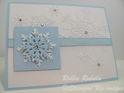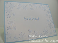 I also ran into a “use snowflakes” challenge at Stampin’ B’s Design Team. I immediately thought of the Northern Flurry embossing folder. I thought it would look nice with the main snowflakes in the upper right hand corner. The rest is pretty easy to understand. Here is my creation.