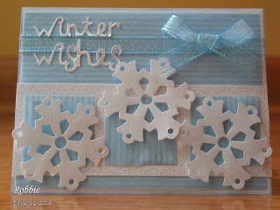 Stamps: All Year Cheer I Paper: blue vellum (had it for a while so don’t remember the details), Bashful Blue, white Ink: Bashful Blue Accessories: Bashful Blue marker, Sizzix Sizzlets Winter Phrase set, snowflake punch (borrowed from a friend – don’t remember the name), Martha Stewart snowflake border punch, ribbon (Pink Hedgehog), sticky tape, dimensionals