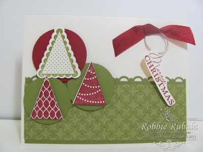 When I saw the 3 circles I did some thinking and decided I would like to do Christmas trees. I pulled out my Pennant Parade and some retired ds paper and started working. I when I laid the trees on the card it did not look right so I decided to punch some circles and pop the trees on the circles. I think it is super cute! I also moved the sentiment and ribbon to get an element in the upper corner. Here is what I created.