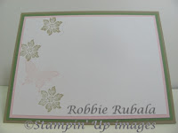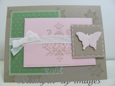 I was ready to create. I had gotten several new SAB sets and wanted to use one so I chose the Bliss set. I love this set and would love to see it in the new catalog in August. The rest was pretty easy. I used some of the Patterns Designer Series Paper Stack. I love this paper and it is a great deal for paper. When my card was finished I used some of the pearls (another great deal) and added them to my butterfly. Here is my finished creation.