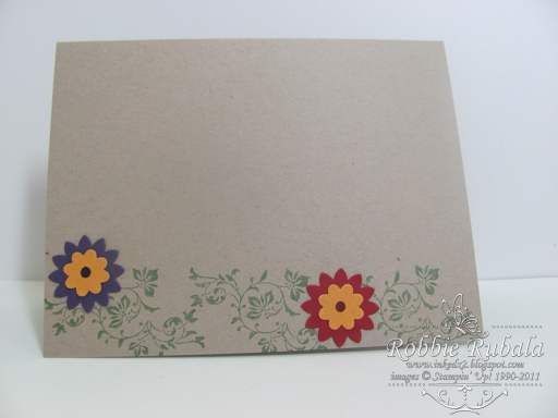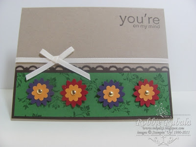 I used the color challenge at VC_Rocks for my colors. You were to use 3 of the Regals colors and a brown from the Neutrals collection. I tried to think of what I could do. The colors are all pretty dark and then to add a brown in there you could get a very dark card. I love using the Regals but I usually combine another brighter color to offset them. I decided to use Mustard, Cherry, and Eggplant and make flowers. I also threw in Garden for a panel so I used 4 of the colors. For my brown I used 2 Espresso and Crumb. Here is my final creation.