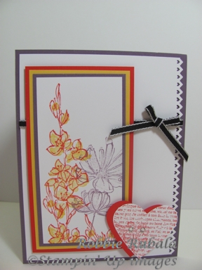 I also needed another sample for our challenge at Late Night Stampers – Hearts Abound. I usually change the shapes but in this case I kept the heart and used it so I could make a card for our challenge also. I used some unusual colors with this card but they still work – looks better in real life. Here is my creation.