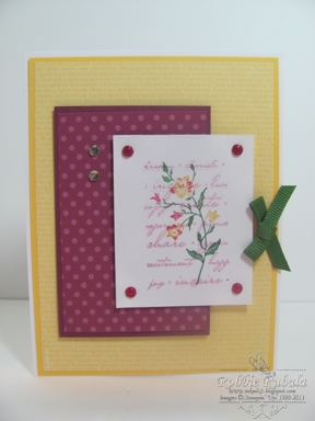 Now all I need to do is make my card.  I thought it would be neat to use the Charming set as the main image  and the word panel as a background.  The problem with that is that the colors are too bold for it and if you offstamp it, it is either too dark or too light not matter how many times you stamp it.