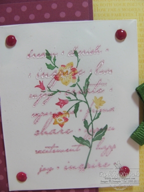 Then I had a bright idea to stamp it on a window sheet.  Well that didn’t work as the ink wouldn’t dry and it smeared even though I had used my heating tool.  Then I thought about embossing it.  When I did that the Razzleberry almost faded away.  When I laid it on top of the stamped image you can hardly see it.  I do like it though.  Here is my creation.